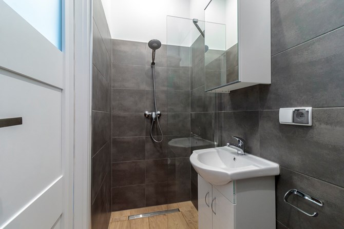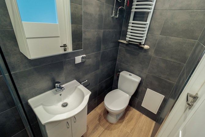 Łazienka: kabina prysznicowa, WC, szafka z umywalką, szafka z lustrem.