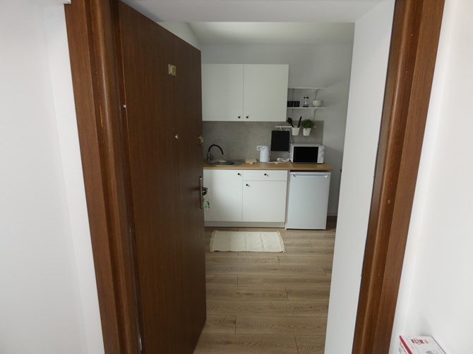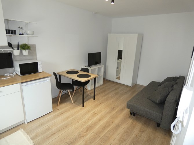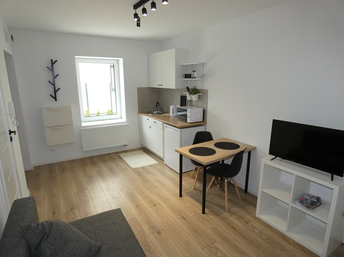 Pokój z aneksem: szafki na buty, szafki wiszące i stojące, wersalka z funkcją spania, komoda, stolik, krzesła, mikrofalówka, lodówko-zamrażarka, płyta indukcyjna 1 pole, czajnik elektryczny, telewizor.