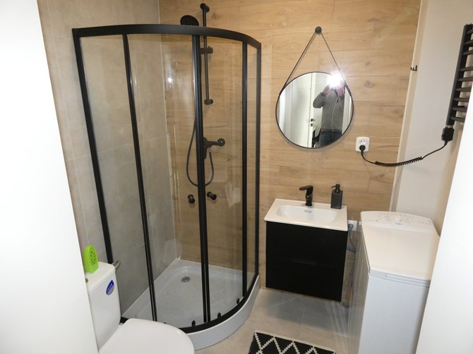 Łazienka razem z WC: kabina prysznicowa, lustro z umywalką, szafka, pralka.