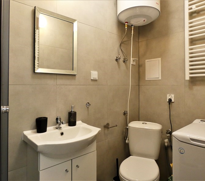 Łazienka: kabina prysznicowa, pralka, WC.