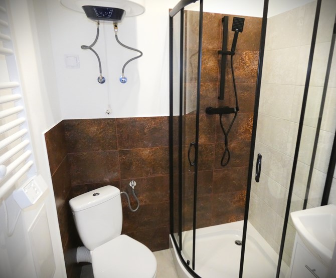 Łazienka: kabina prysznicowa, umywalka, bojler elekt.