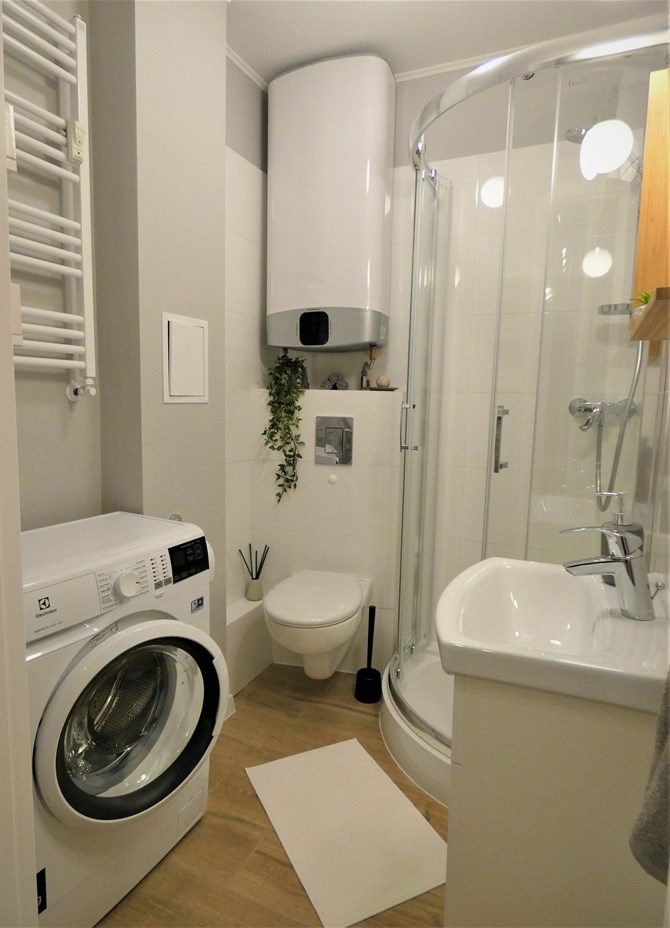 Łazienka razem z WC: lustro z półką, umywalka, kabina prysznicowa, pralka.