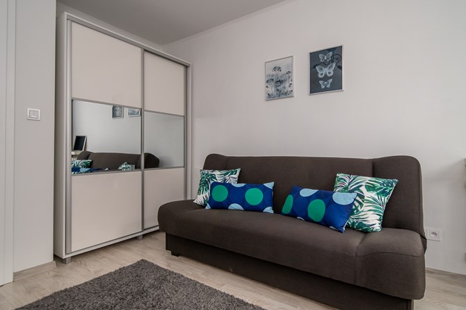 Pokój: rozkładana kanapa, szafa, biurko z krzesłem oraz półki.