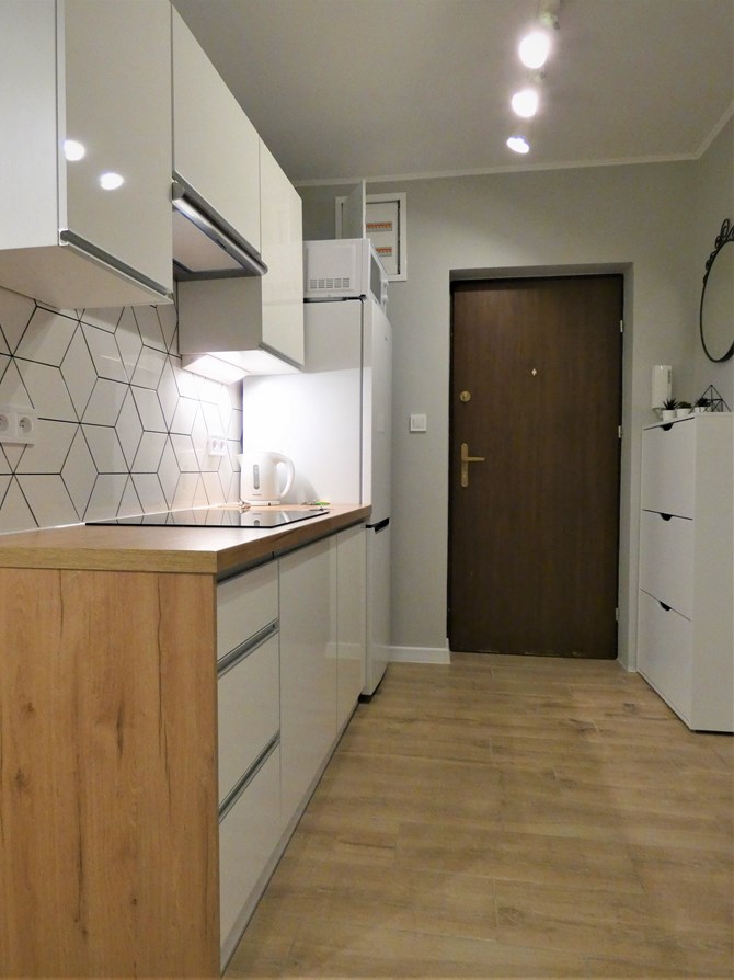 Kuchnia: szafki stojące i wiszące, płyta grzewcza, okap, lodówka, zmywarka, mikrofala, zlewozmywak.
