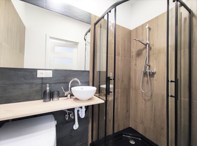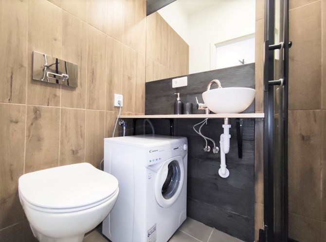 Łazienka razem z WC: umywalka z półką na przybory toaletowe, lustro, kabina prysznicowa, pralka, podtynkowe WC.