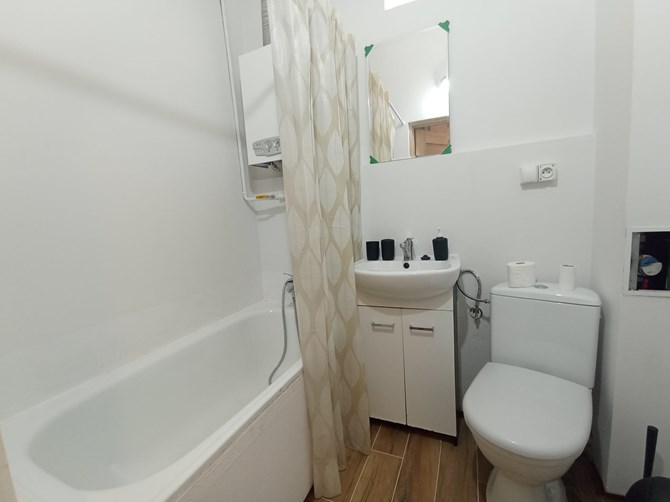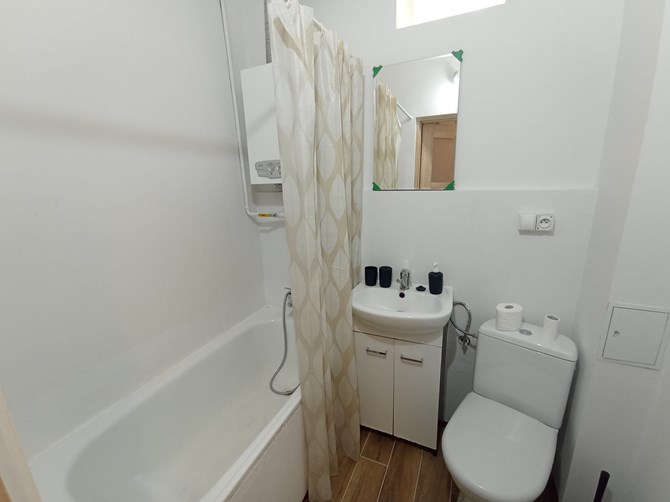 Łazienka z WC: wanna, umywalka, szafka, lustro