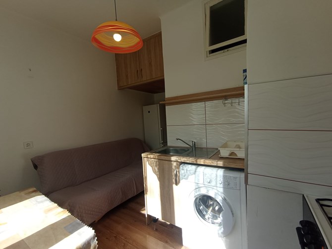 Kuchnia: szafki, kuchenka gazowa, pralka, lodówka, kanapa, stół