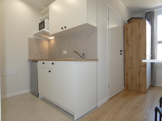 Kuchnia: szafki wiszące i stojące, lodówka, dwupalnikowa płyta elektryczna, zlewozmywak, mikrofalówka.