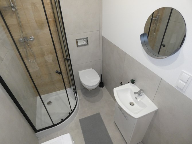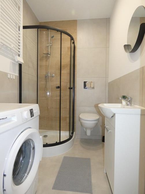 Łazienka razem z WC: lustro z półką, kabina prysznicowa, pralka