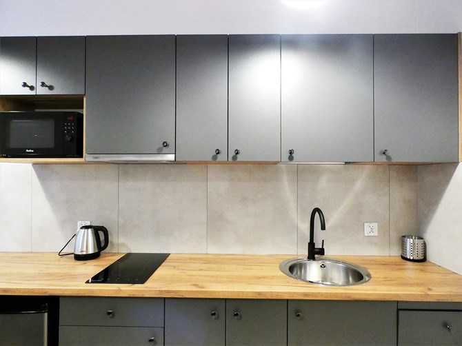 Pokój z aneksem: rozkładana kanapa, stolik kawowy, dwa krzesła, szafa, komoda, szafki wiszące i stojące, lodówka, dwupalnikowa płyta indukcyjna, kuchenka mikrofalowa, okap, zlewozmywak.
