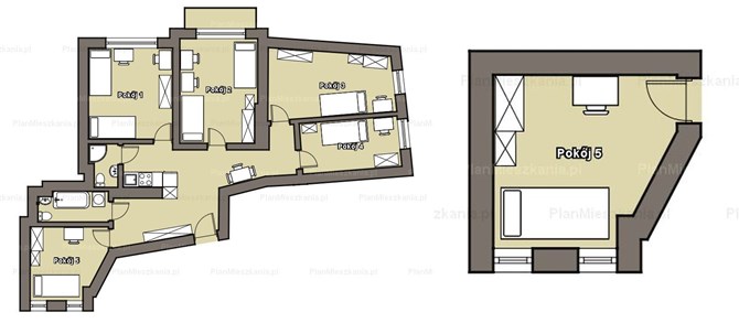 Mieszkanie składa się z pięciu osobnych pokoi oraz dwóch łazienek – jedna z wanną i pralką, druga z kabiną prysznicową.