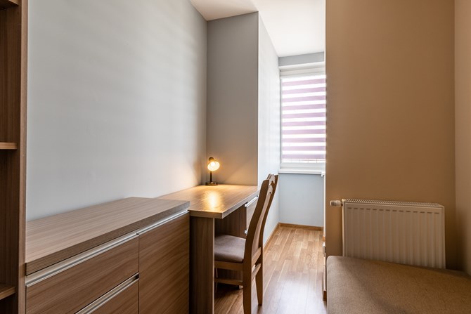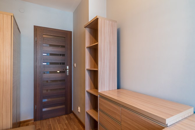 Pokój: pojedyncze łóżko, pojemna szafa, komoda, biurko, szafka z półkami na książki.