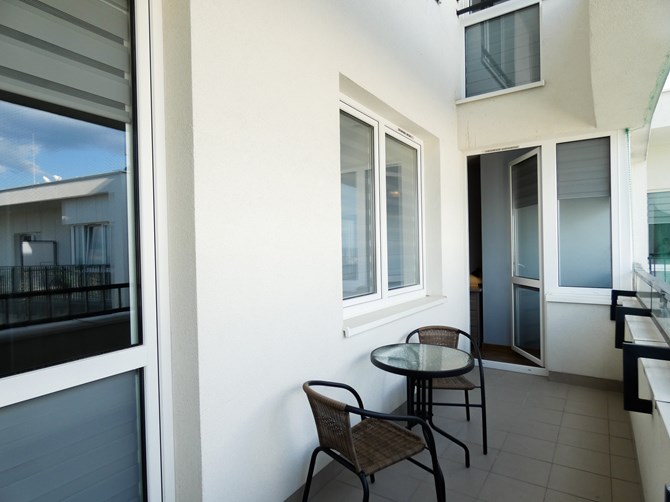 Wspólny balkon wyposażony w stół i dwa fotele – idealne miejsce do relaksu.