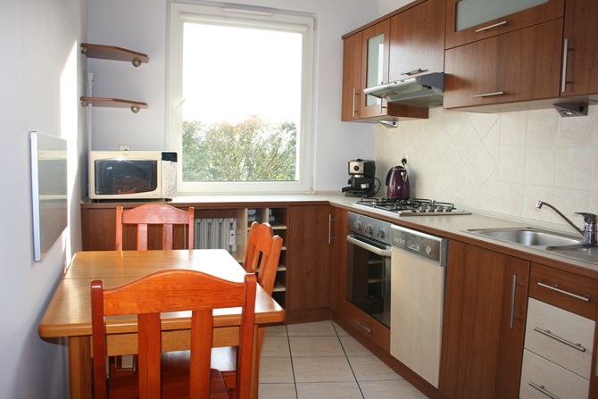 Kuchnia: zmywarka, mikrofalówka, lodówka z zamrażalnikiem, kuchenka z piekarnikiem, czajnik elektryczny, zlewozmywak, szafki wiszące i stojące, stół, krzesła.