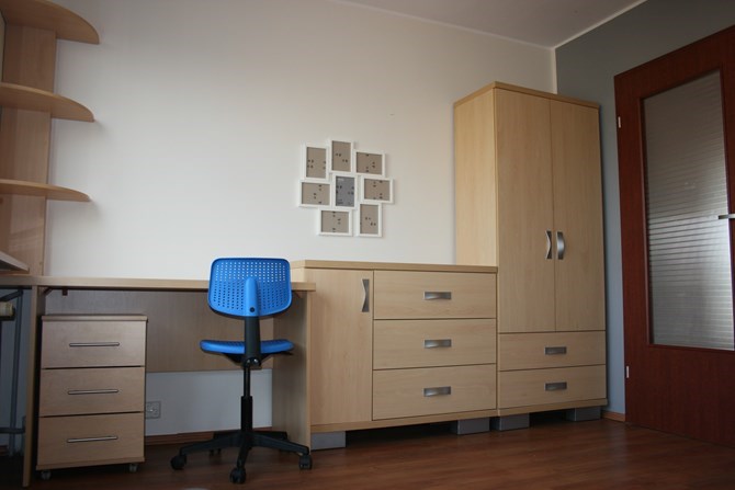 Pokój 1: łóżko, biurko, krzesło, szafa, szafki stojące, półki.