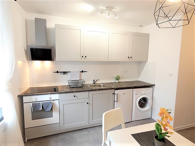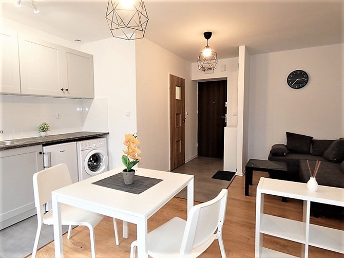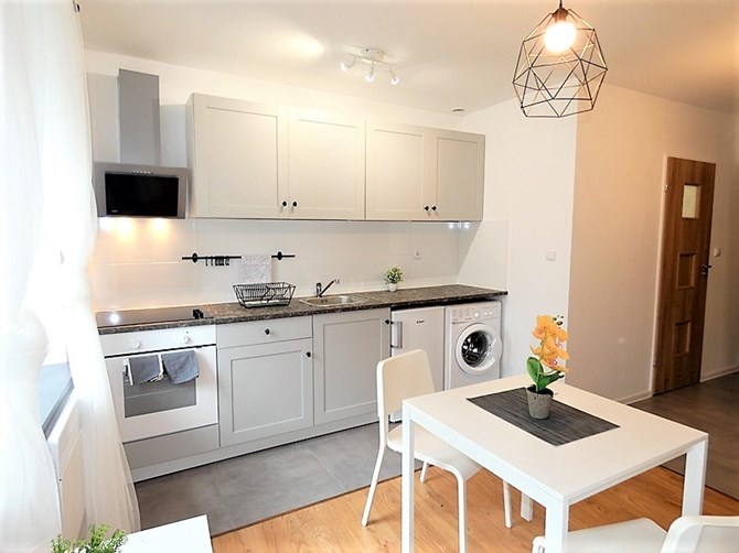 Aneks kuchenny: szafki kuchenne, zlewozmywak, płyta ceramiczna 4-palnikowa, piekarnik, lodówka, pralka, stół, krzesła.
