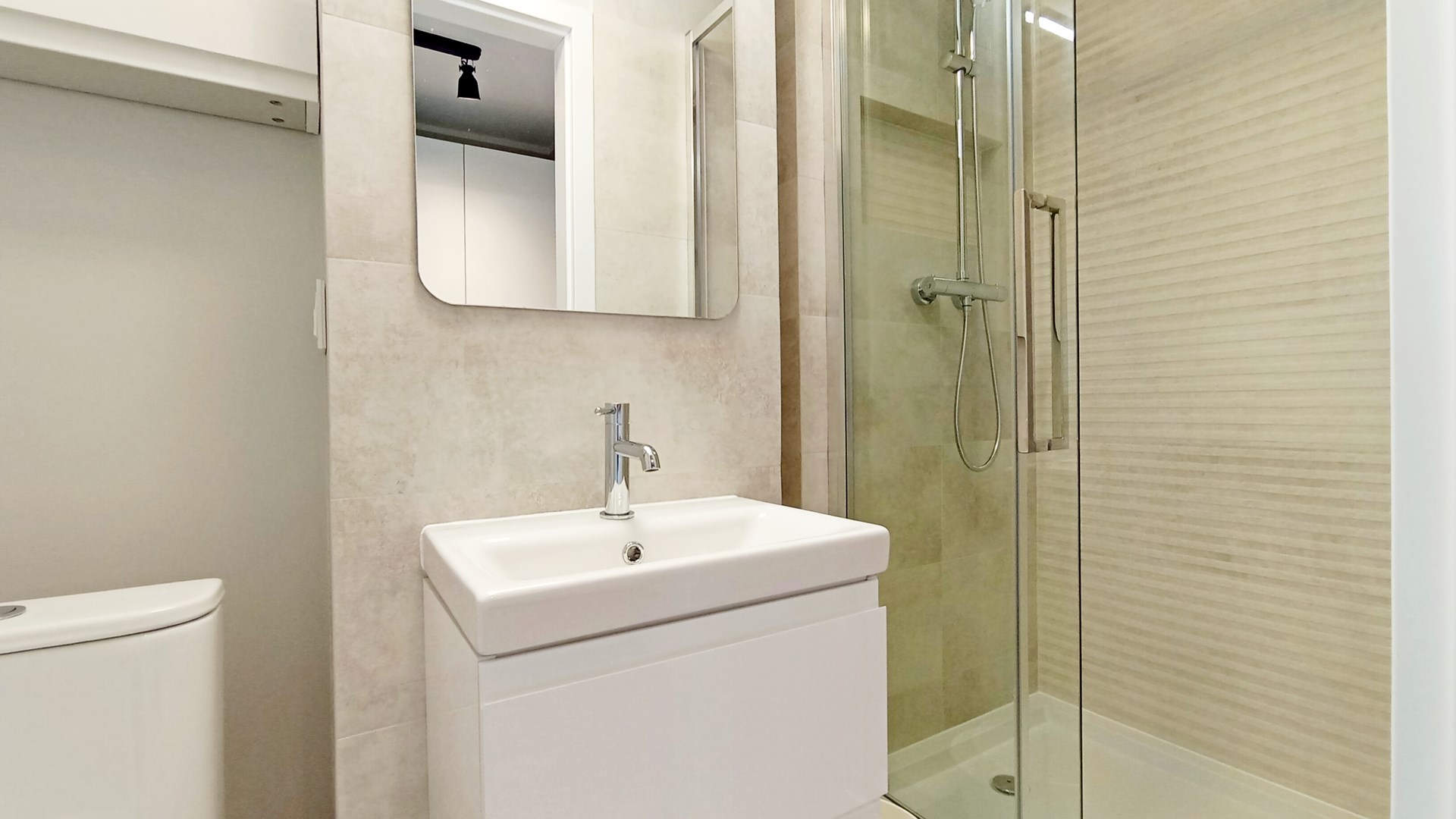 Łazienka: kabina prysznicowa, WC, umywalka.