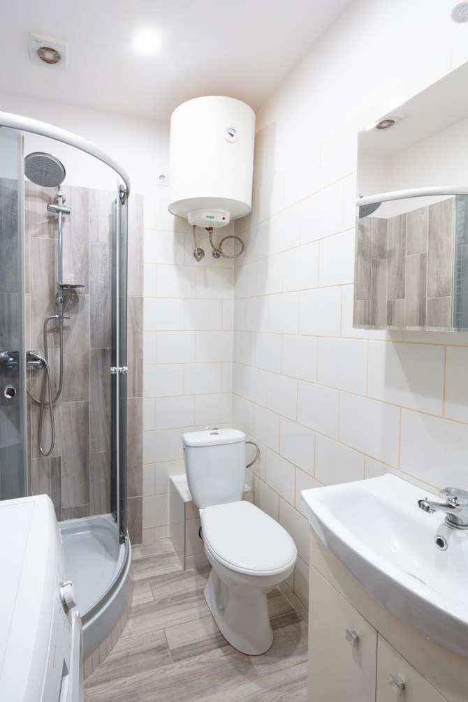 Łazienka z WC: kabina prysznicowa, umywalka z szafką, lustro, pralka, bojler elektryczny.