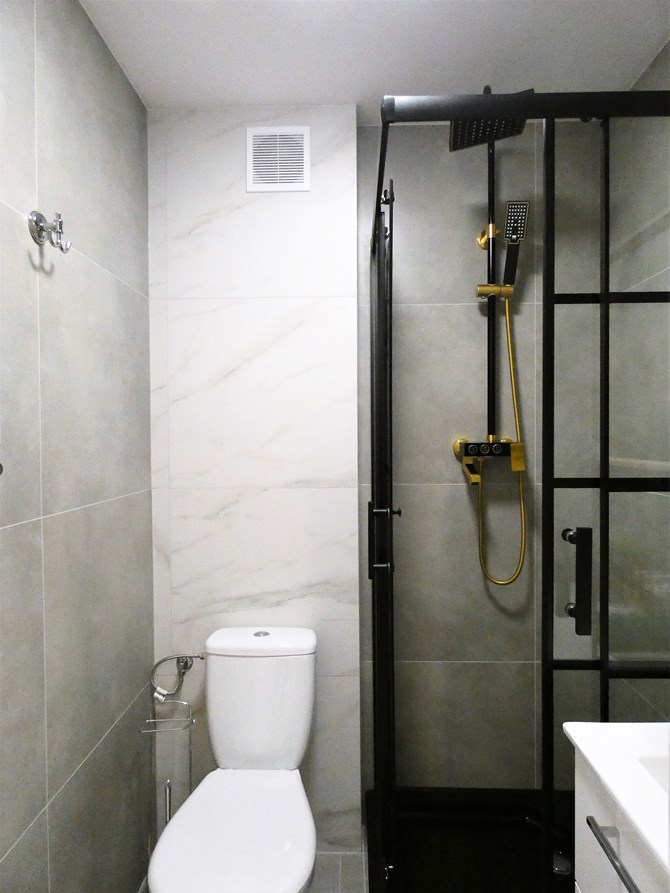 Łazienka z WC: kabina prysznicowa, pralka, umywalka, lustro.