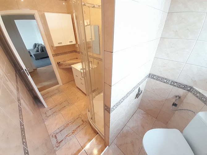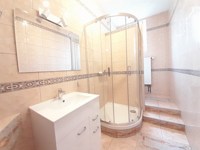 Łazienka z WC: kabina prysznicowa, umywalka, szafka, lustro.