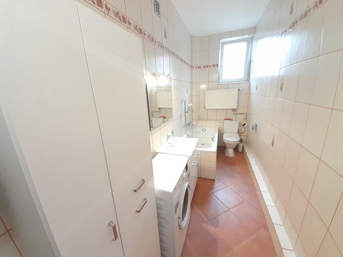 Łazienka z WC: pralka, wanna, umywalka, szafka, lustro.