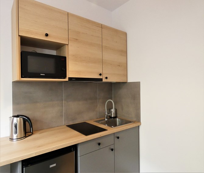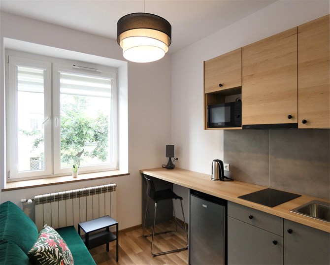 Pokój z aneksem kuchennym: szafki, lodówka, kuchenka dwupalnikowa, okap, zlewozmywak, rozkładana sofa, szafa, stolik, krzesła.