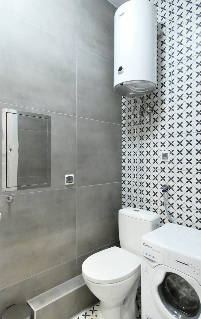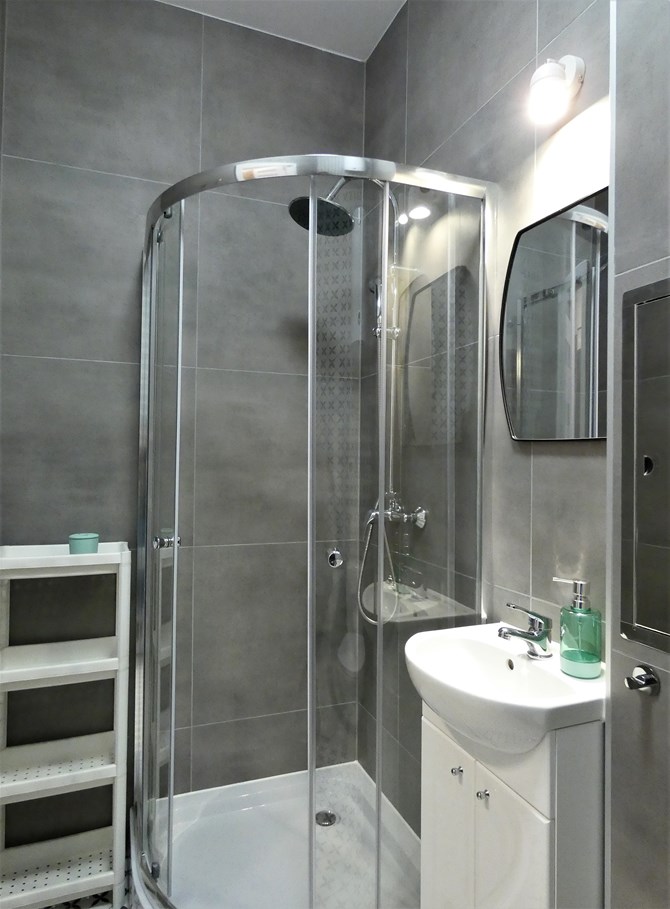 Łazienka z WC: kabina prysznicowa, lustro, umywalka, pralka.