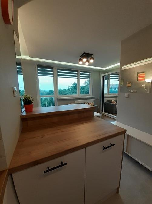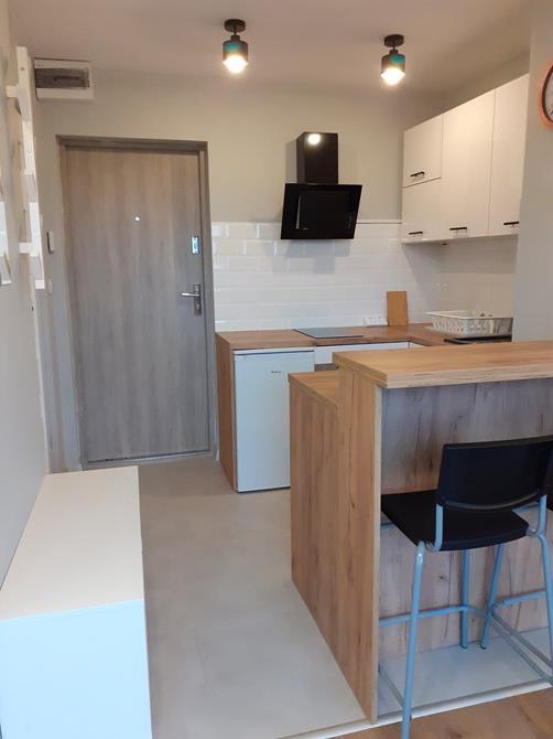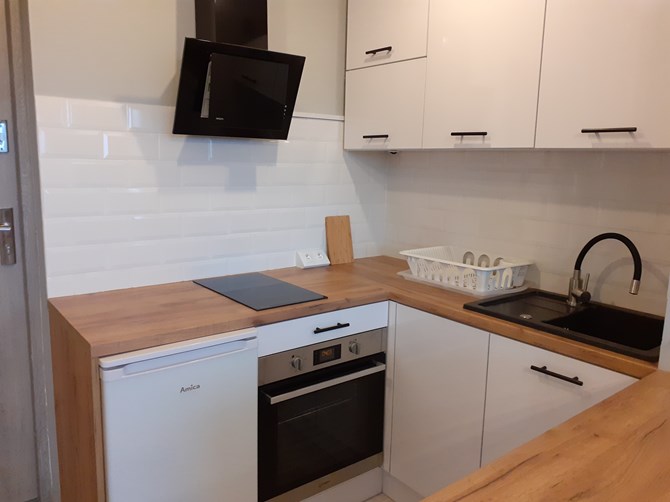 Kuchnia: kuchni szafki wiszące i stojące, lodówka, dwupalnikowa płyta indukcyjna, zlewozmywak