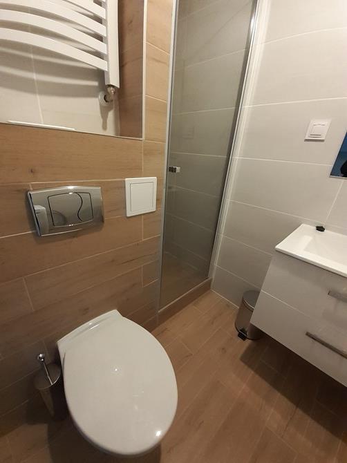 Łazienka razem z WC: lustro z półką, kabina prysznicowa, pralka