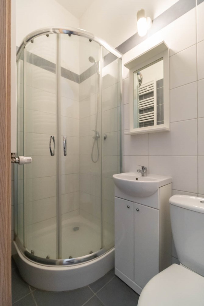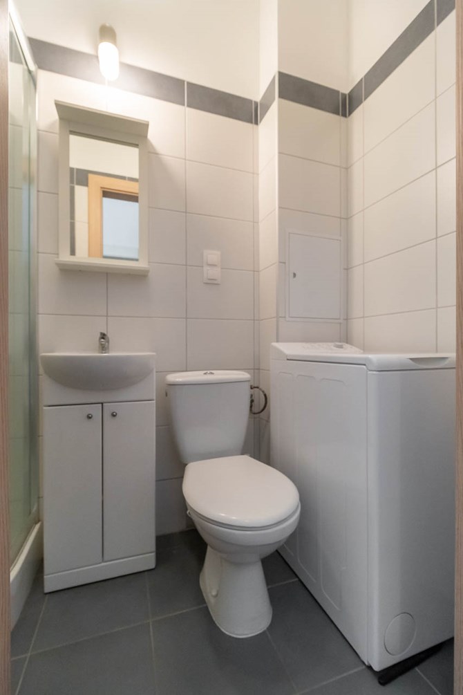 Łazienka razem z WC: kabina prysznicowa, lustro z półką, pralka.