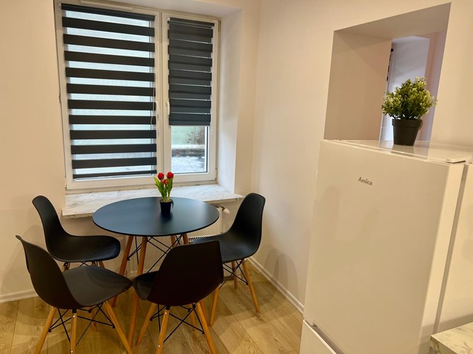 Aneks kuchenny: meble, piekarnik, lodówka, stół, krzesła, płyta elektryczna.
