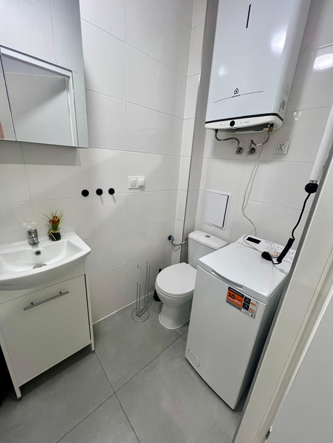 Łazienka z WC: kabina prysznicowa, szafka, lustro, pralka.