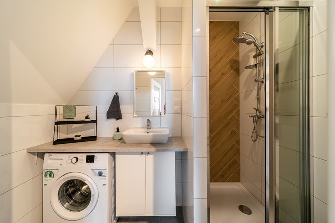 Łazienka razem z WC: lustro z półką, kabina prysznicowa, pralka.