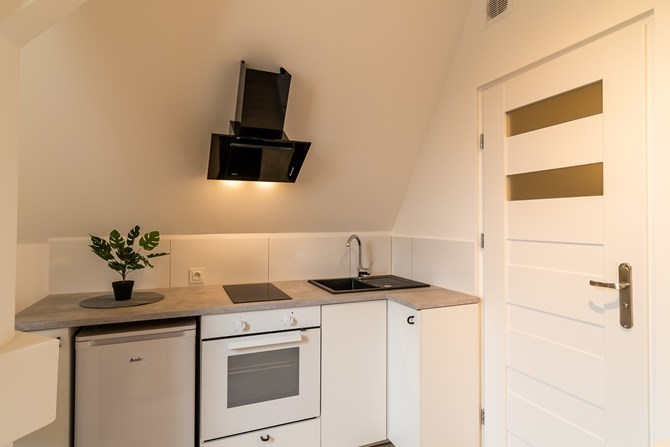 Aneks kuchenny: kuchni szafki wiszące i stojące, lodówka, dwupalnikowa płyta indukcyjna, zlewozmywak, piekarnik.