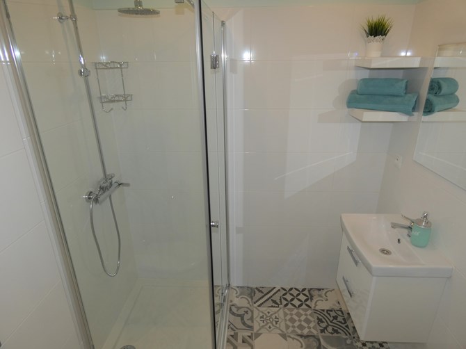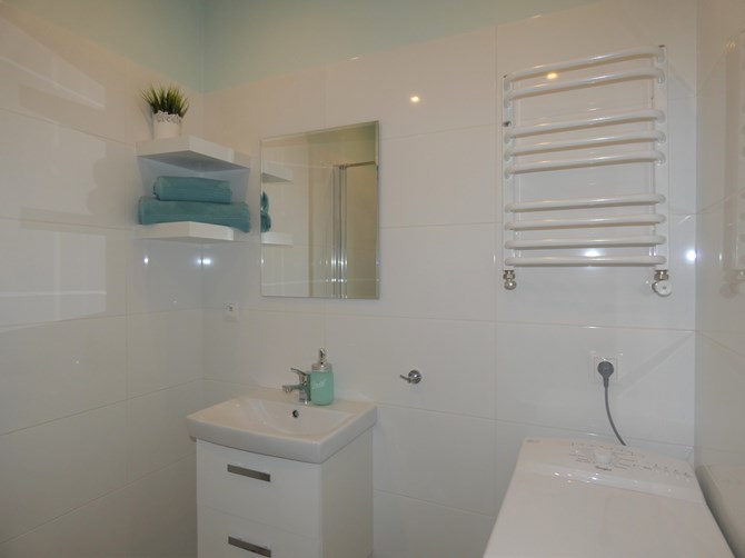 Łazienka z WC: umywalka z szafką, lustro, prysznic, pralka oraz półki na przybory toaletowe.