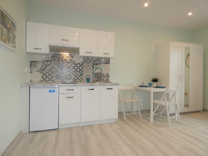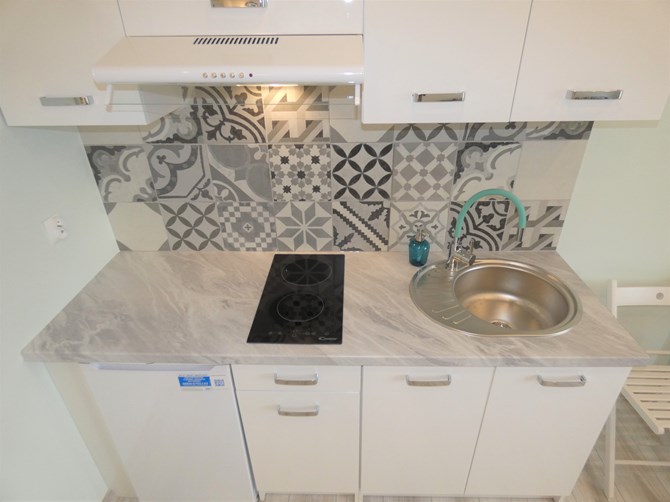 Aneks kuchenny: szafki wiszące i stojące, lodówka, dwupalnikowa płyta grzewcza, okap, zlewozmywak.