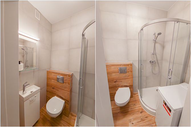 Łazienka razem z WC: kabina prysznicowa, pralka, umywalka, toaleta.