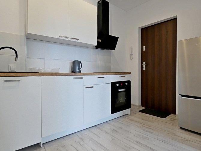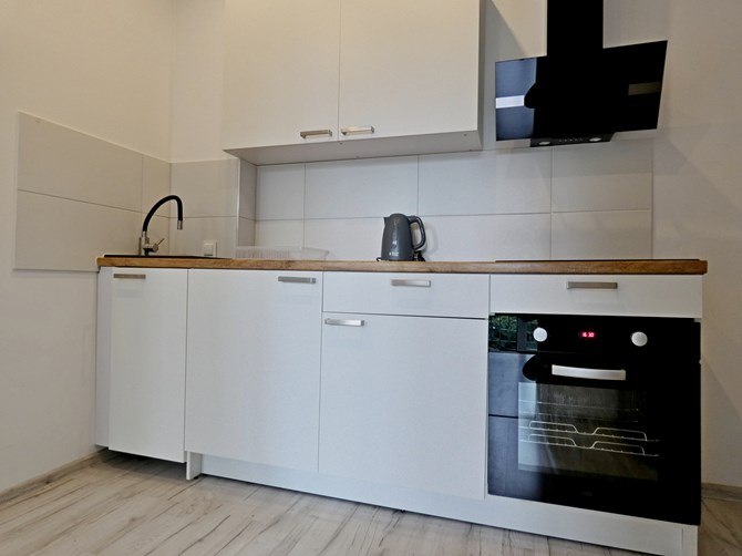 Kuchnia: lodówko-zamrażarka, okap, 4-palnikowa płyta indukcyjna, piekarnik, czajnik elektryczny, zlew.