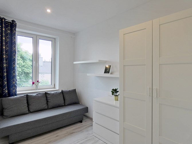 Pokój nr 2: kanapa rozkładana, komoda, szafa.