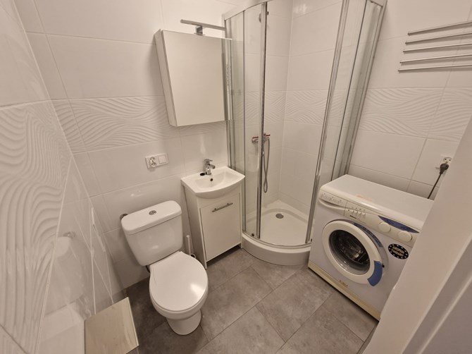 Łazienka: kabina prysznicowa, umywalka, szafka i lustro, pralka