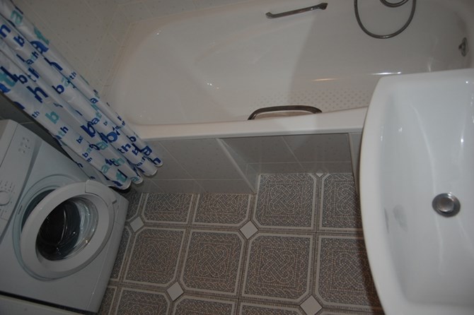 W łazience wanna, WC, pralka oraz umywalka z lustrem i szafką.