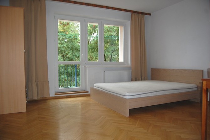 W dużym pokoju, podwójne łóżko z materacem, regał, stół z krzesłami, szafa.