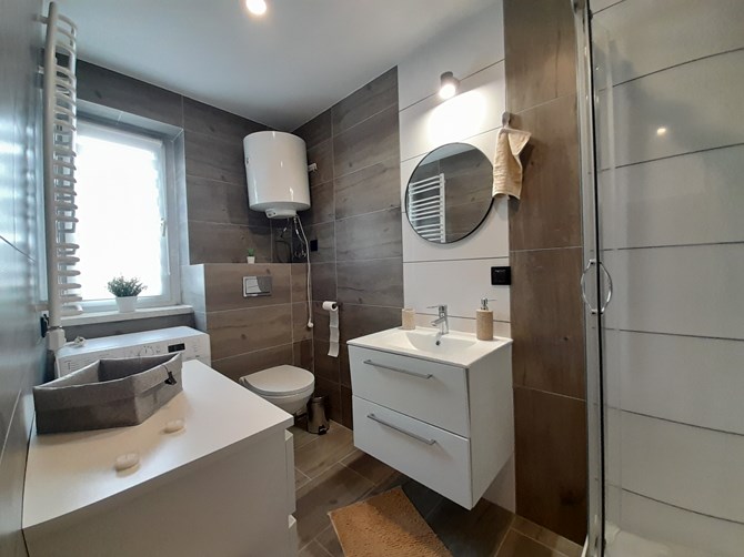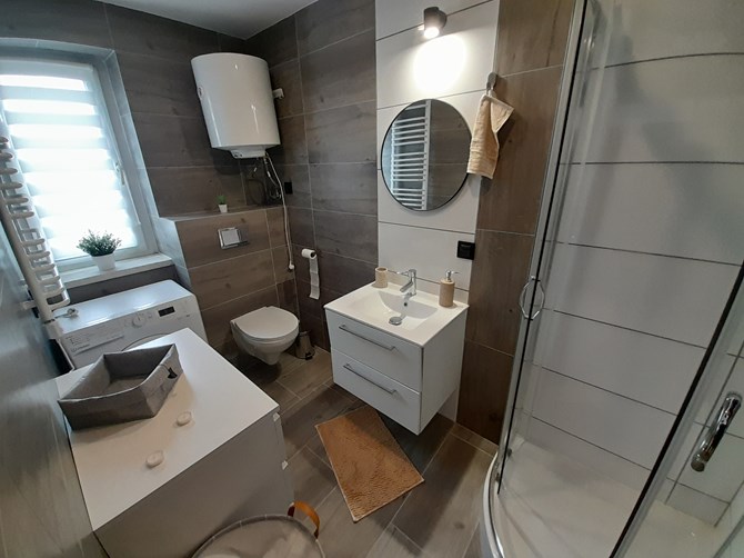 Łazienka z WC: pralka, kabina prysznicowa, umywalka, szafka, komoda, lustro.