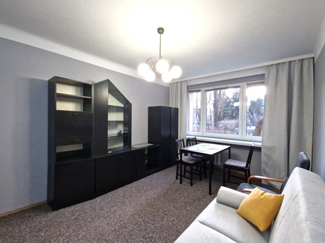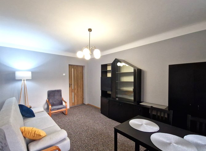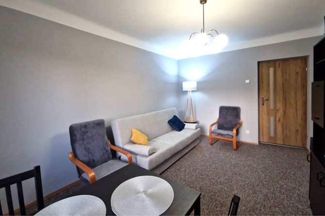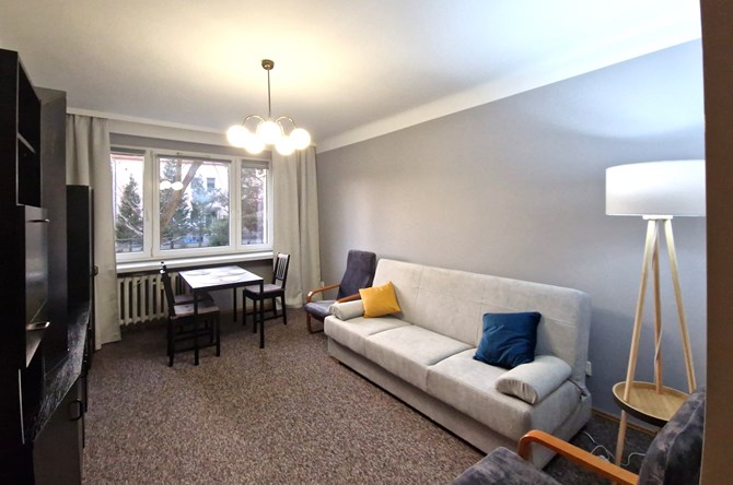 Pokój 1: rozkładana kanapa, stół z krzesłami, komoda, szafki, szafa, lampa.