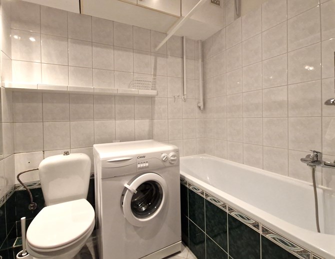 Łazienka (razem z WC): lustro, szafki, pralka, wanna.