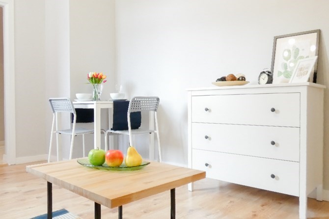 Pokój: rozkładana sofa, szafa 2 drzwiowa, komoda, stół z 2 krzesłami i stolik kawowy