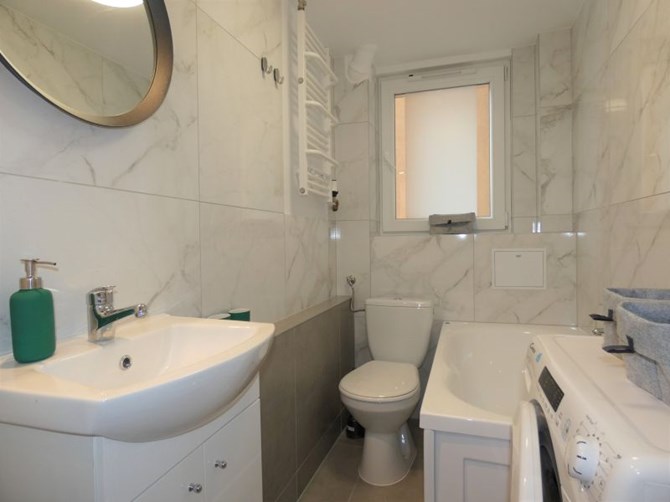 Łazienka: wanna, umywalka z szafką, lustro, WC.