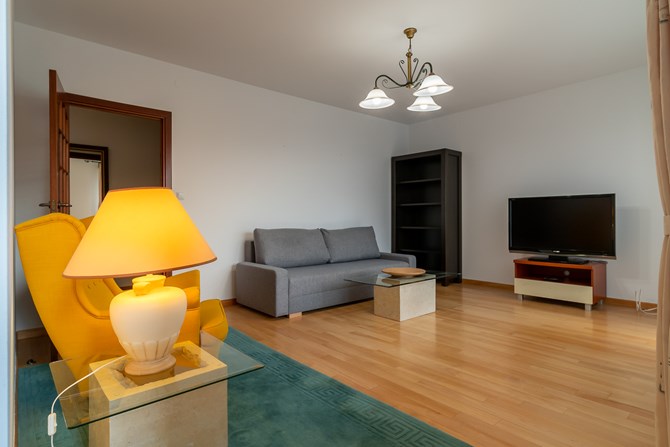 *Salon: rozkładana kanapa, regał, komoda, stoliki kawowe, fotel.
