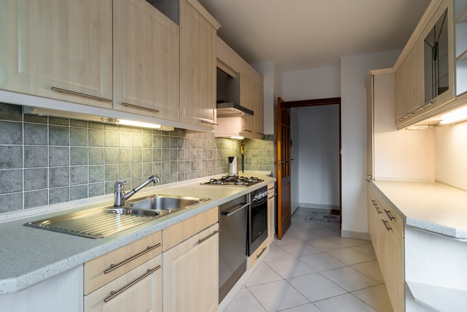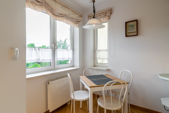 *Kuchnia: szafki, stół, 4 krzesła, lodówka, piekarnik elektryczny, 4-palnikowa kuchnia gazowa, okap, zmywarka.