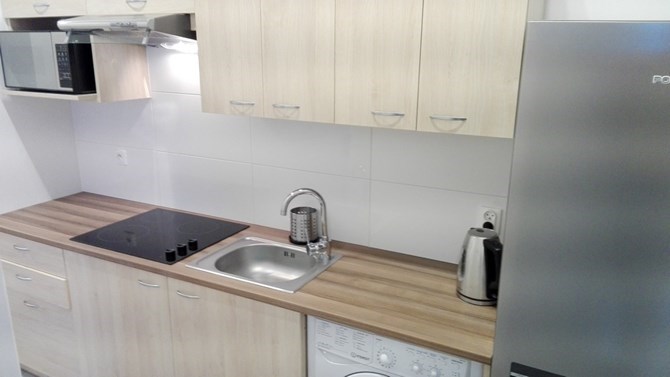 Aneks kuchenny: szafki kuchenne, okap, kuchenka elektryczna, kuchenka mikrofalowa, lodówka z zamrażalnikiem, zlew, pralka.